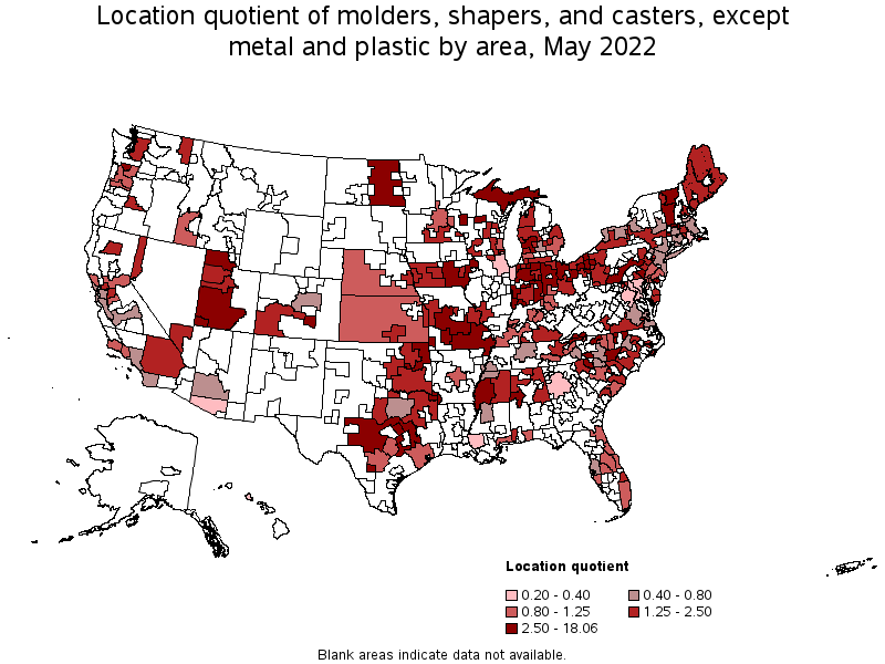 States and areas with the highest published employment, location quotients, and wages for Molders, Shapers, and Casters, Except Metal and Plastic are provided. For a list of all areas with employment in Molders, Shapers, and Casters, Except Metal and Plastic, see the Create Customized Tables function.