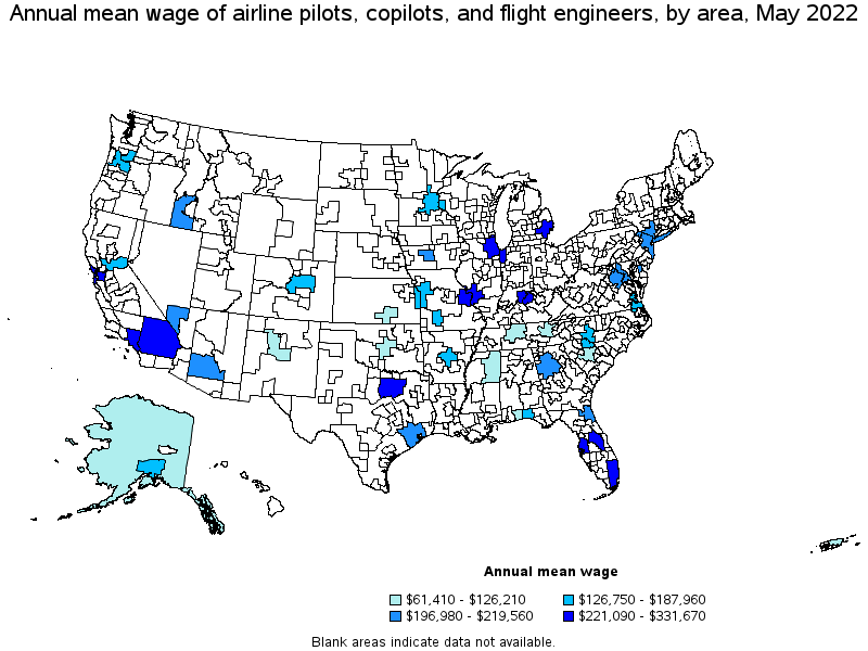 States and areas with the highest published employment, location quotients, and wages for Airline Pilots, Copilots, and Flight Engineers are provided. For a list of all areas with employment in Airline Pilots, Copilots, and Flight Engineers, see the Create Customized Tables function.
