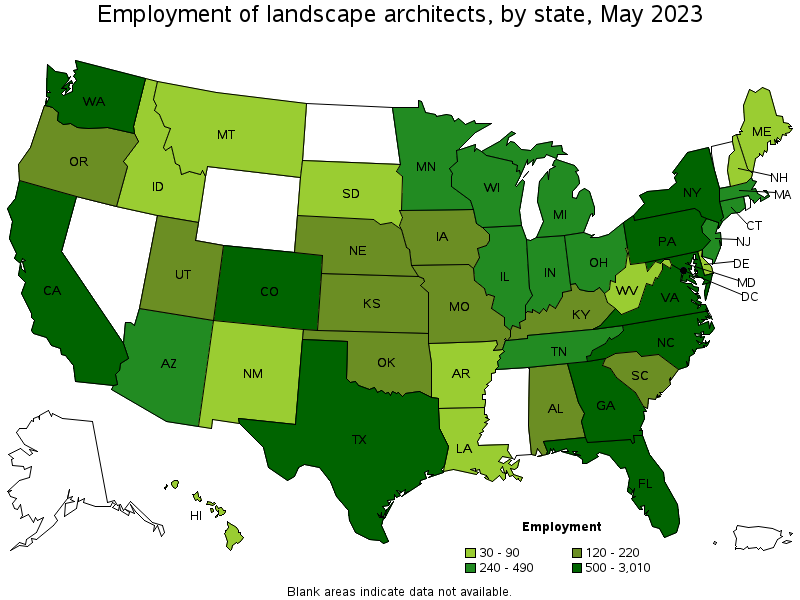 States and areas with the highest published employment, location quotients, and wages for Landscape Architects are provided. For a list of all areas with employment in Landscape Architects, see the Create Customized Tables function.