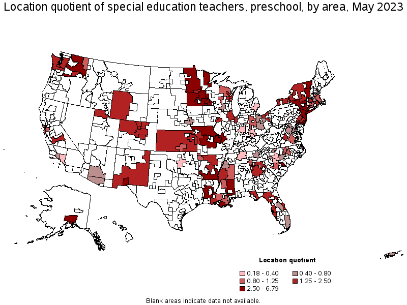 States and areas with the highest published employment, location quotients, and wages for Special Education Teachers, Preschool are provided. For a list of all areas with employment in Special Education Teachers, Preschool, see the Create Customized Tables function.