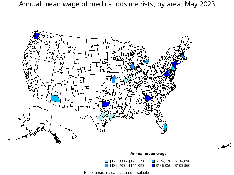 States and areas with the highest published employment, location quotients, and wages for Medical Dosimetrists are provided. For a list of all areas with employment in Medical Dosimetrists, see the Create Customized Tables function.