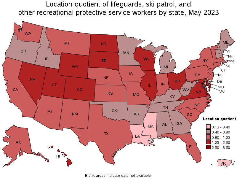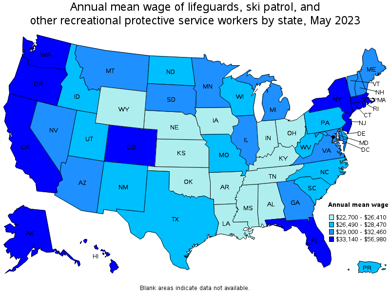 States and areas with the highest published employment, location quotients, and wages for Lifeguards, Ski Patrol, and Other Recreational Protective Service Workers are provided. For a list of all areas with employment in Lifeguards, Ski Patrol, and Other Recreational Protective Service Workers, see the Create Customized Tables function.
