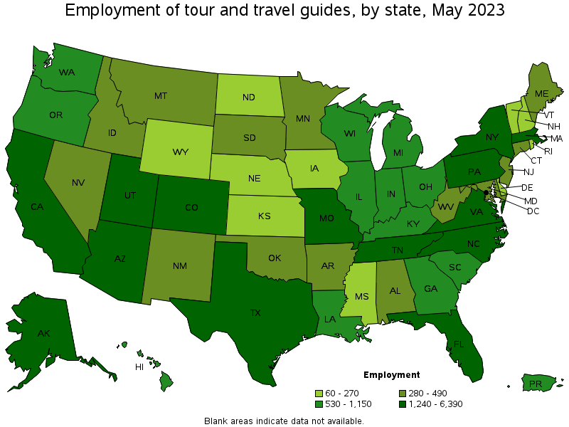 States and areas with the highest published employment, location quotients, and wages for Tour and Travel Guides are provided. For a list of all areas with employment in Tour and Travel Guides, see the Create Customized Tables function.