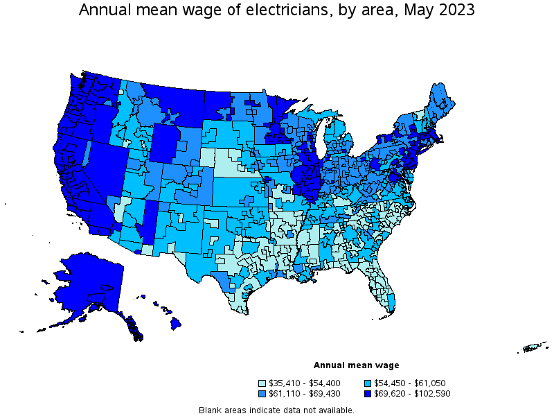 States and areas with the highest published employment, location quotients, and wages for Electricians are provided. For a list of all areas with employment in Electricians, see the Create Customized Tables function.