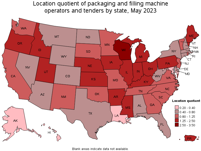 States with the highest concentration of jobs and location quotients in Packaging and Filling Machine Operators and Tenders: