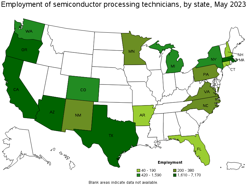 States and areas with the highest published employment, location quotients, and wages for Semiconductor Processing Technicians are provided. For a list of all areas with employment in Semiconductor Processing Technicians, see the Create Customized Tables function.