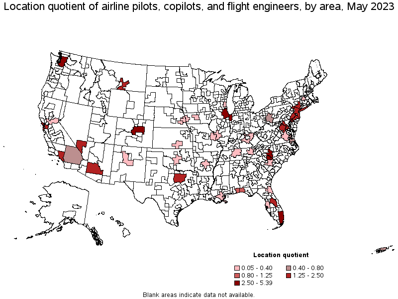 Metropolitan areas with the highest concentration of jobs and location quotients in Airline Pilots, Copilots, and Flight Engineers: