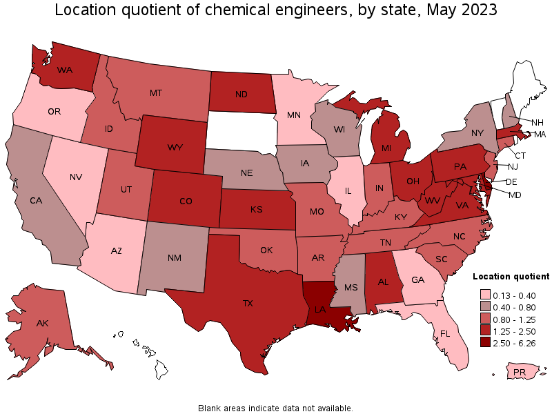 States and areas with the highest published employment, location quotients, and wages for Chemical Engineers are provided. For a list of all areas with employment in Chemical Engineers, see the Create Customized Tables function.