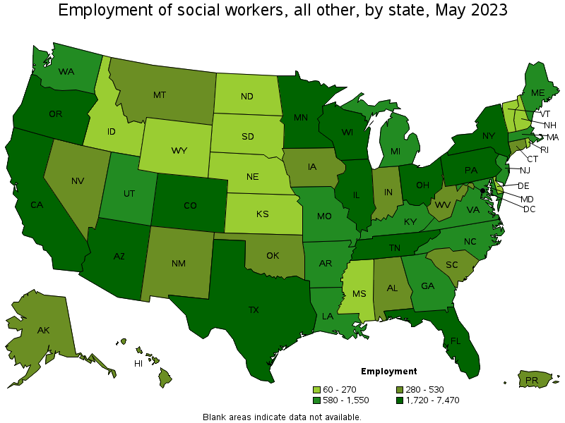 States and areas with the highest published employment, location quotients, and wages for Social Workers, All Other are provided. For a list of all areas with employment in Social Workers, All Other, see the Create Customized Tables function.