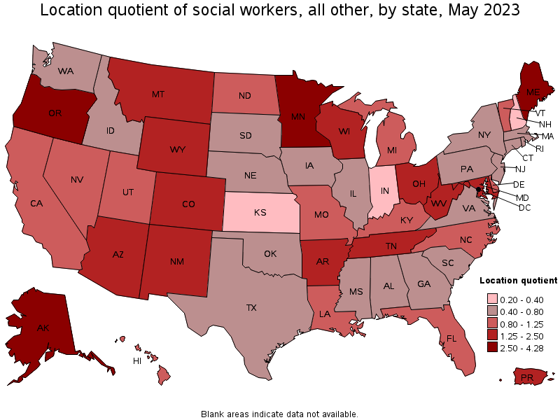 States with the highest concentration of jobs and location quotients in Social Workers, All Other: