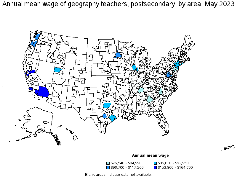 States and areas with the highest published employment, location quotients, and wages for Geography Teachers, Postsecondary are provided. For a list of all areas with employment in Geography Teachers, Postsecondary, see the Create Customized Tables function.