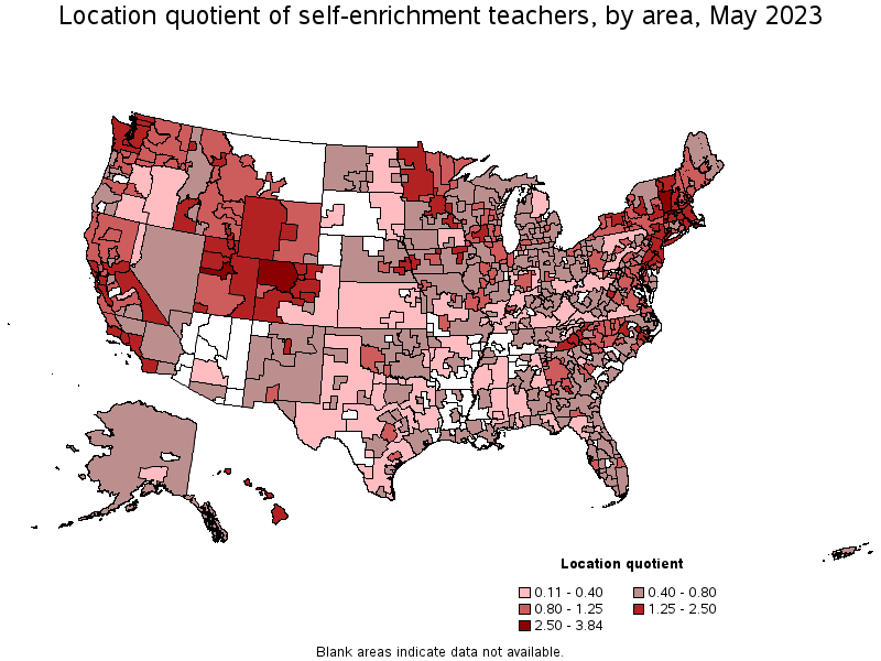 Map of location quotient of self-enrichment teachers by state, May 2023
