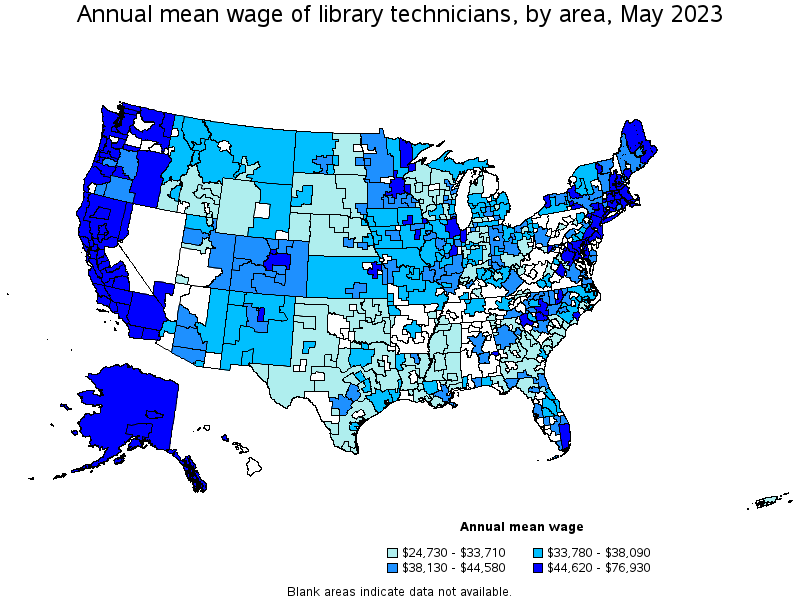 States and areas with the highest published employment, location quotients, and wages for Library Technicians are provided. For a list of all areas with employment in Library Technicians, see the Create Customized Tables function.