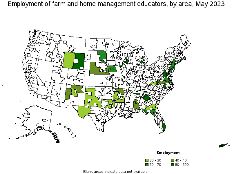 States and areas with the highest published employment, location quotients, and wages for Farm and Home Management Educators are provided. For a list of all areas with employment in Farm and Home Management Educators, see the Create Customized Tables function.