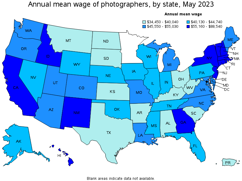 States and areas with the highest published employment, location quotients, and wages for Photographers are provided. For a list of all areas with employment in Photographers, see the Create Customized Tables function.
