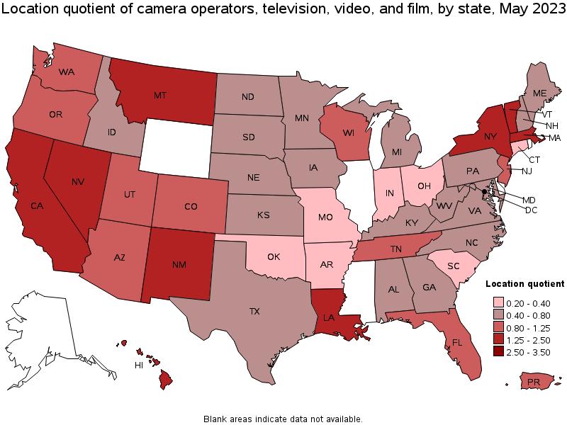 States and areas with the highest published employment, location quotients, and wages for Camera Operators, Television, Video, and Film are provided. For a list of all areas with employment in Camera Operators, Television, Video, and Film, see the Create Customized Tables function.