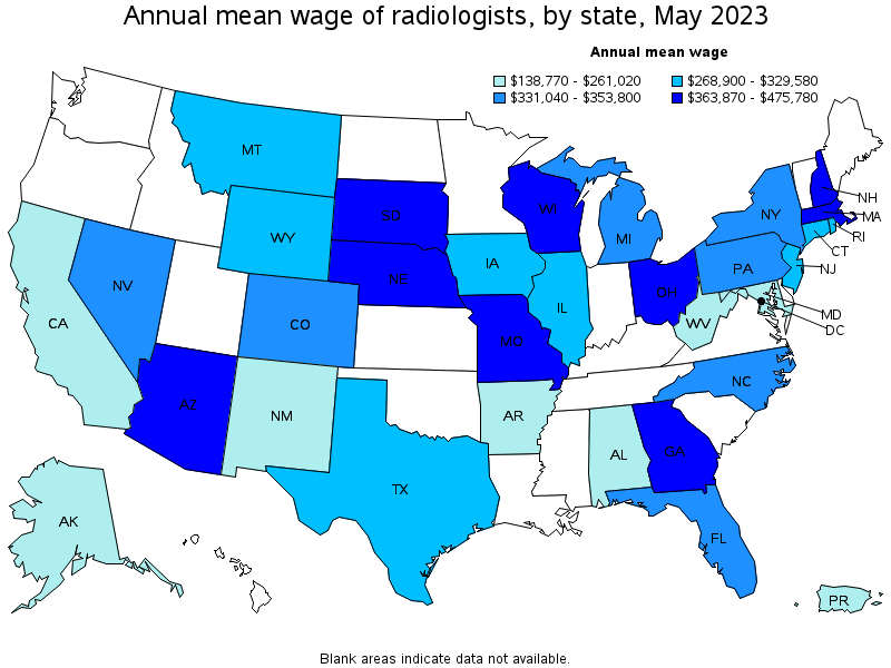 States and areas with the highest published employment, location quotients, and wages for Radiologists are provided. For a list of all areas with employment in Radiologists, see the Create Customized Tables function.