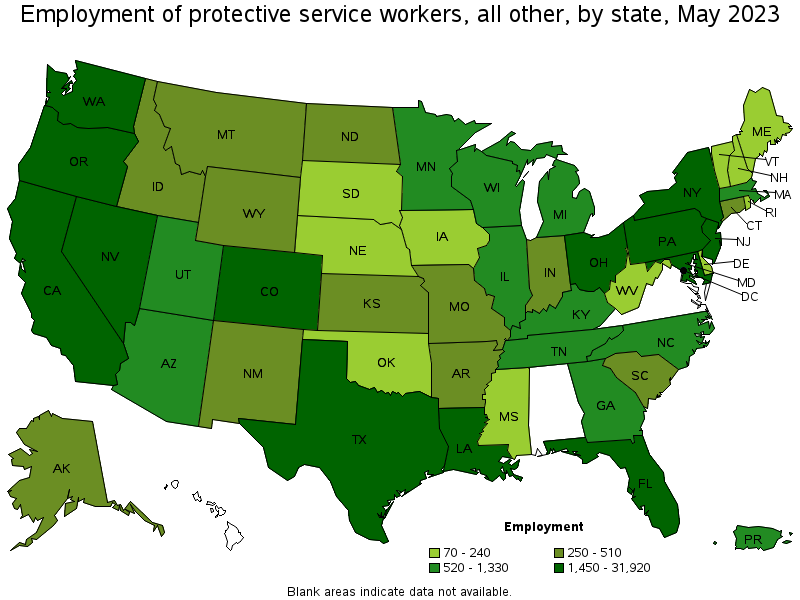 States and areas with the highest published employment, location quotients, and wages for Protective Service Workers, All Other are provided. For a list of all areas with employment in Protective Service Workers, All Other, see the Create Customized Tables function.