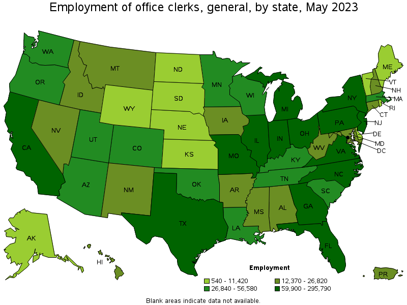States and areas with the highest published employment, location quotients, and wages for Office Clerks, General are provided. For a list of all areas with employment in Office Clerks, General, see the Create Customized Tables function.
