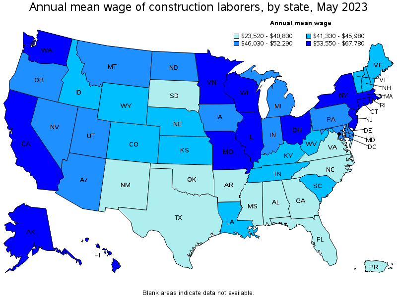 States and areas with the highest published employment, location quotients, and wages for Construction Laborers are provided. For a list of all areas with employment in Construction Laborers, see the Create Customized Tables function.