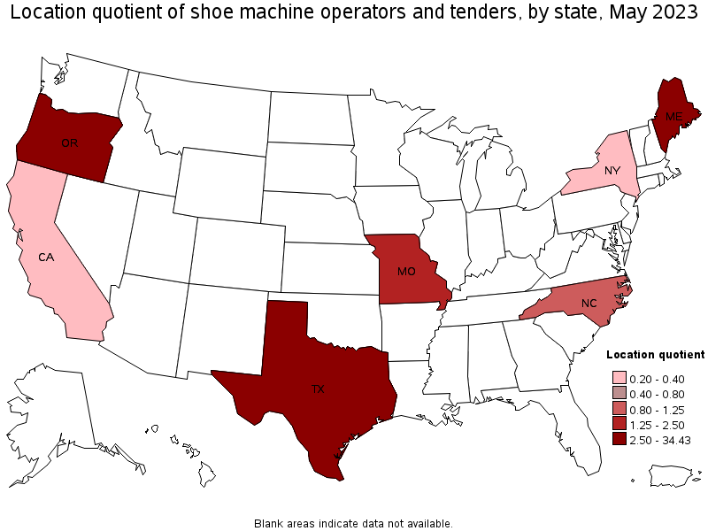 States with the highest concentration of jobs and location quotients in Shoe Machine Operators and Tenders: