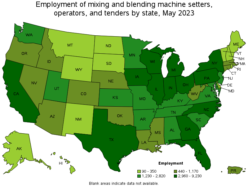 States and areas with the highest published employment, location quotients, and wages for Mixing and Blending Machine Setters, Operators, and Tenders are provided. For a list of all areas with employment in Mixing and Blending Machine Setters, Operators, and Tenders, see the Create Customized Tables function.