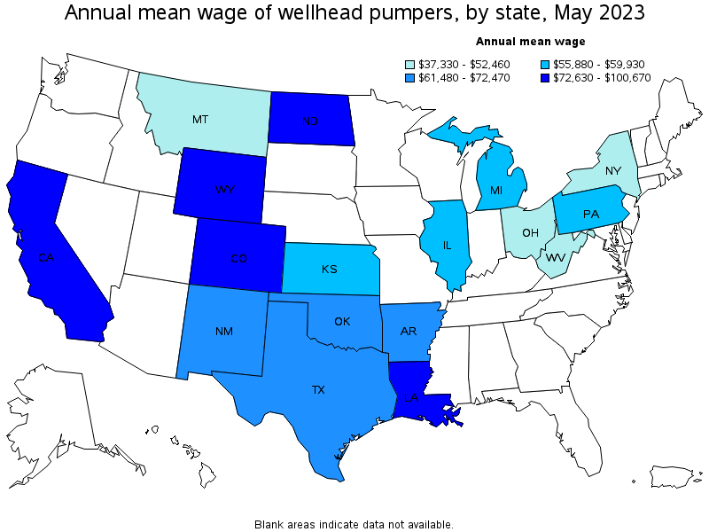States and areas with the highest published employment, location quotients, and wages for Wellhead Pumpers are provided. For a list of all areas with employment in Wellhead Pumpers, see the Create Customized Tables function.