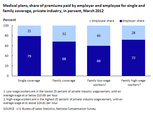 Private industry employers paid, on average, 79 percent of premiums for single coverage and 68 percent of premiums for family coverage. For low-wage employees with family coverage, the employee premium share required for employer-provided medical plans was approximately 40 percent higher than for high-wage workers. (See chart 1.)