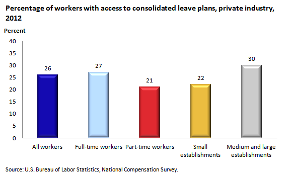 About one-fourth of all workers were enrolled in consolidated leave plans in 2012. Consolidated leave plans are common in the insurance and healthcare industries. Plans were more prevalent among full-time employees (27 percent) than part-time workers (21 percent). Consolidated leave plans were available to 30 percent of workers in medium and large establishments, greater than the 22 percent of workers in small establishments. Provisions were also more generous in medium and large establishments. For example, workers with 1 year of service were provided 17 days. By 20 years of service, 27 days were available. In contrast, workers in small establishments were provided 13 days after 1 year of service and 22 days after 20 years of service. (See chart 1.)