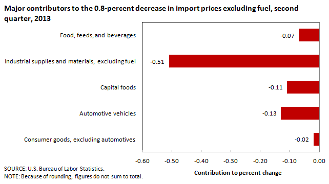 Each of the major finished goods areas recorded declines over the second quarter of 2013, in part because of the rising value of the U.S. dollar. Prices for automotive vehicles fell 0.9 percent for the quarter ended in June, the largest quarterly decrease in the index since a 1.0-percent drop in June 1991. Capital goods prices declined 0.3 percent between March and June: the most recent quarter that this index increased was the third quarter of 2012. The price index for consumer goods also decreased in the second quarter, edging down 0.1 percent.