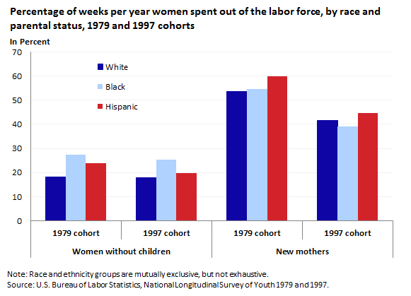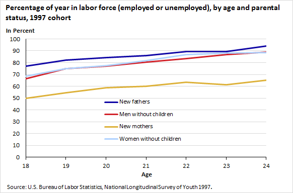 Judith Dey, “How has labor force participation among young moms and dads changed? A comparison of two cohorts,” Beyond the Numbers: Employment & Unemployment, vol. 3, no. 19 (U.S. Bureau of Labor Statistics, September 2014), https://www.bls.gov/opub/btn/volume-3/how-has-labor-force-participation-among-young-moms-and-dads-changed.htm