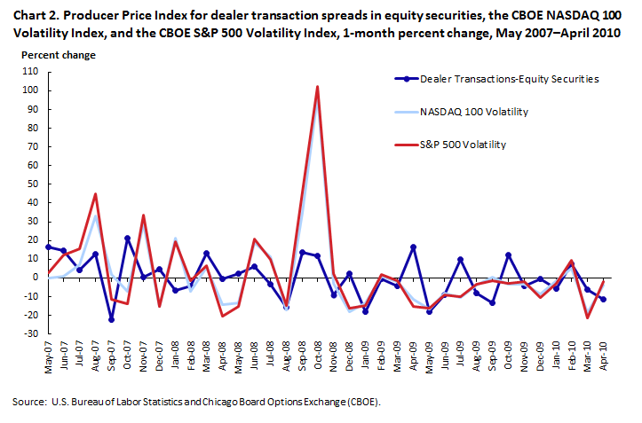 As the financial crisis ended in 2009, both spreads and volatility declined in a similar fashion. Between June 2009 and April 2010, the PPI for dealer transactions-equity securities, the NASDAQ 100 Volatility Index, and the S&P Volatility Index decreased 21.6 percent, 40.4 percent, and 40.2 percent, respectively.9