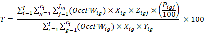 Other estimates of incidence, such as the percentage of participants in a benefit area or in a subset of a benefit area, can be computed in a similar manner, such that the base includes only those workers who participate in the benefit-area plans. For example, to calculate the percentage of medical insurance participants in fee-for-service plans in domain , a ratio is calculated such that the denominator is the same as the numerator in the previous formula and the numerator is of the same form as well, except that the summation is restricted to those participants in fee-for-service plans.