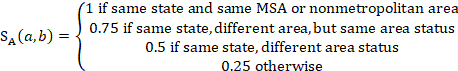 Donors in the same geographic area are preferred and are treated at four different matching levels. Units in the same state and metropolitan statistical area (MSA) or nonmetropolitan area have an area match score of 1. Units receive an area match score of 0.75 if they are in two different areas of the same state, but both areas have the same area status—that is, both are MSAs or both are nonmetropolitan areas. Units receive a score of 0.5 if they are in two different areas of the same state, and one area is an MSA and the other is a nonmetropolitan area. Finally, units from different states receive a score of 0.25. The score component reflecting differences in area is calculated as follows: