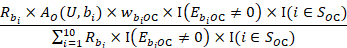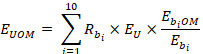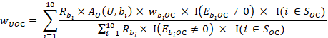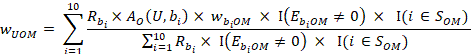 The occupational wage w predicted for unit U for wage interval M is derived from a weighted composite of the occupational employment of the donor units. Assuming 10 donors, this is given by: