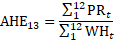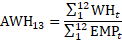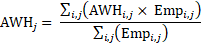 Average weekly hours are published in hours rounded to the tenths place, and rounded values are used in aggregation. Aggregate or summary levels of average weekly hours (AWH) are weighted by employment in component industries. Estimates of AWH at the basic levels are multiplied by employment estimates to calculate aggregate hours. Aggregate hours are summed for the basic industries and then divided by their summed employment. The process repeats at each level as data are aggregated to higher level summaries. The aggregation method for AWH of AE and PE is identical with the appropriate substitution of AE or PE employment and hours data in equation 13.