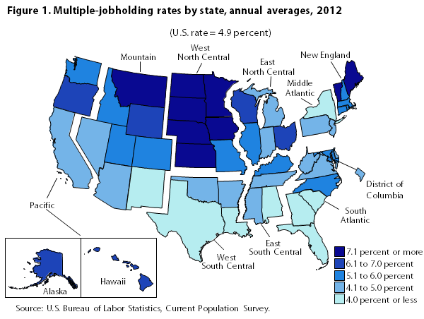 In 2012, South Dakota recorded the highest multiple-jobholding rate of any state, 9.5 percent, followed by Vermont, 8.6 percent, and Nebraska, 8.5 percent.1 Four additional states had multiple-jobholding rates of 8.0 percent or above. Most of the states with high multiple-jobholding rates in 2012 have had consistently high rates over the time span during which estimates have been available. Florida had the lowest multiple-jobholding rate of any state in 2012, 3.4 percent. Four other states recorded rates below 4.0 percent. The annual average multiple-jobholding rate for the United States was 4.9 percent in 2012, unchanged from 2011 and 2010. No state had a statistically significant over-the-year change in its multiple-jobholding rate.