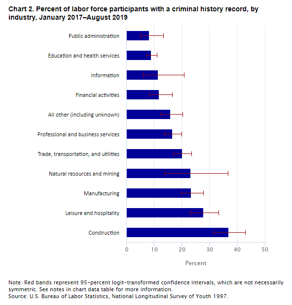 | Note: CHR = criminal history record; CI = confidence interval. The chart shows the survey-weighted percentage of labor force participants with a CHR within each industry, sorted from lowest to highest percentage. Red bands represent 95-percent logit-transformed confidence intervals. The logit-transformed confidence intervals are asymmetric because our data include values of 0 and 1 and computing typical standard errors could result in a lower-bound value of less than 0. Labor force status is determined by using work history data between January 2017 and August 2019. A labor force participant is defined as a person who worked at least 1 week (in either full- or part-time status) or was classified as unemployed in at least 1 week between January 2017 and August 2019. Respondents are grouped by their first self-reported industry, regardless of employment status. The National Longitudinal Survey of Youth 1997 (NLSY97) sample is restricted to people who responded to the NLSY97 COVID-19 Supplement, which was fielded between February and May 2021. Source: U.S. Bureau of Labor Statistics, National Longitudinal Survey of Youth 1997 and NLSY97 COVID-19 Supplement. | ||||