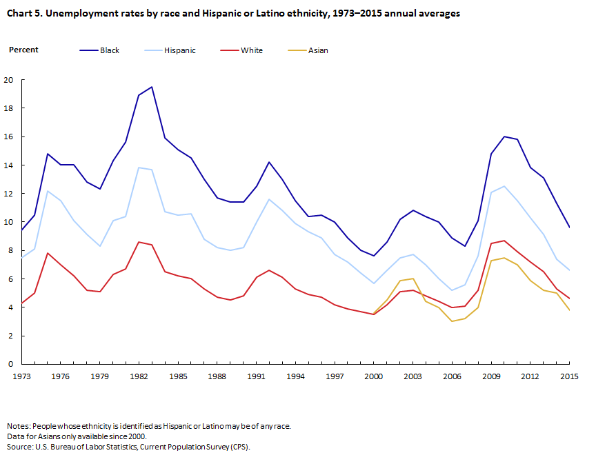 In 2015, the overall unemployment rate for the United States was 5.3 percent; however, the rate varied across race and ethnicity groups. The rates were highest for American Indians and Alaska Natives (9.9 percent) and for Blacks (9.6 percent) and lowest for Asians (3.8 percent). The jobless rate was 4.6 percent for Whites, 5.7 percent for Native Hawaiians and Other Pacific Islanders, and 8.4 percent for people of Two or More Races. The rate for people of Hispanic or Latino ethnicity was 6.6 percent, higher than the rate of 5.0 percent for non-Hispanics.