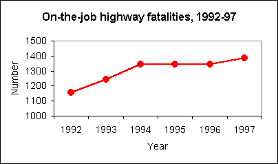A total of 1,387 highway fatalities were reported in 1997, the highest level since the BLS fatality census began in 1992. Highway fatalities averaged 1,287 from 1992 to 1996. Highway crashes were the leading cause of on-the-job fatalities, accounting for 22 percent of the 1997 fatal work injury total.