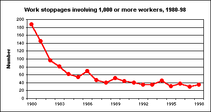 Although low by historical standards, the number of work stoppages that began in 1998 was slightly higher than the total reported in 1997. The thirty-four stoppages idled 387,000 workers and resulted in 5.1 million days of idleness. Thirty stoppages occurred in the private sector, with an equal split between manufacturing and nonmanufacturing industries.