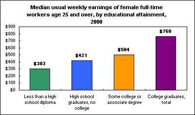 Median usual weekly earnings of women without a high school diploma were $303 per week in 2000, compared with $760 for those with college degrees.