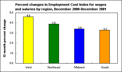The Employment Cost Index for wages and salaries in private industry rose 4.6 percent in the West region in the 12 months ended December 2001. This was the largest increase among the nation’s four regions.