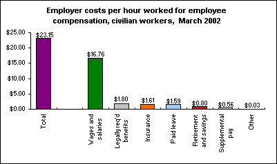 In March 2002, employer costs for employee compensation for civilian workers in the United States averaged $23.15 per hour worked.