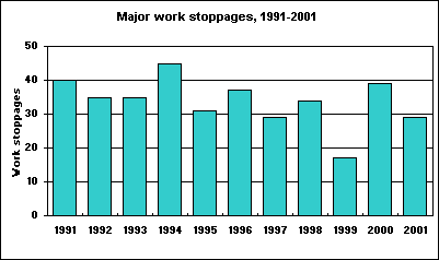 There were 29 major work stoppages that began in 2001, down from 39 in 2000.