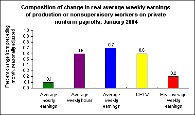 Average weekly earnings rose by 1.7 percent, seasonally adjusted, from January 2003 to January 2004. After deflation by the CPI-W, average weekly earnings declined by 0.1 percent over the year.