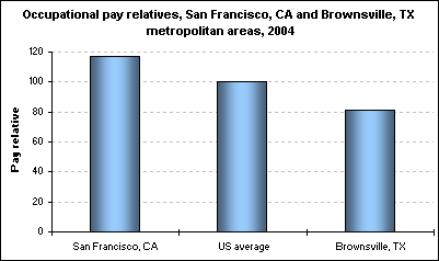 These data are from the BLS National Compensation Survey program. Note that the San Francisco metropolitan area also includes Oakland and San Jose; the Brownsville area also includes Harlingen and San Benito. Learn more in "Occupational Pay Relatives, 2004," news release USDL 05-2382.