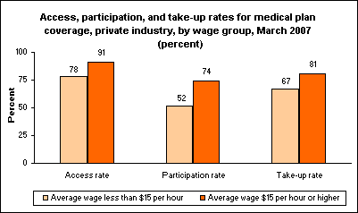Three different rates are calculated to measure health insurance benefits: the access rate, the participation rate, and the take-up rate. The access rate is the ratio of employees in surveyed jobs who are offered a plan to the total number of employees in surveyed jobs. Among lower wage full-time workers, 78 percent have access to medical plan coverage, while among higher wage full-time workers, 91 percent have access to such coverage.