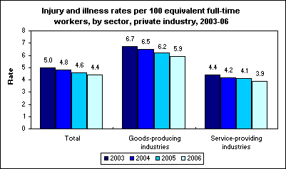There were rate declines for injuries and illnesses in both goods-producing and service-providing industries between 2005 and 2006—the rate fell from 6.2 cases per 100 full-time workers to 5.9 cases in goods-producing industries and from 4.1 cases per 100 full-time workers to 3.9 cases in service-providing industries.