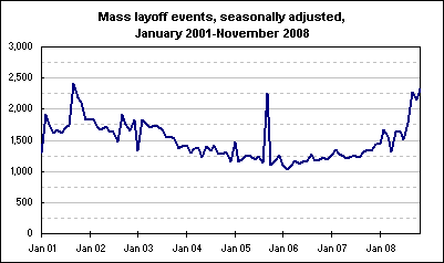 These data are from the Mass Layoff Statistics program and are seasonally adjusted. To learn more, see "Mass Layoffs in November 2008," (PDF) (HTML) news release USDL 08-1829.